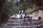 KnorrhütteIn der Nacht hat es wieder geschneit und es ist wolkig. Aber der Wetterbericht verspricht Besserung und es taut auch schon. Selbst die Zugspitze zeigt sich wieder, wenn auch nur kurz. ![]() ![]() An diesem Morgen müssen zunächst alle mitgebrachten Sachen wieder in den Rucksäcken verstaut werden, weil wir für die nächste Nacht auf eine andere Hütte gehen wollen. Auch der Schlafraum muss aufgeräumt werden. Danach erwartet uns der vom Vortag bekannte Weg in Richtung Stuiben. Heute folgen wir ihm bis ganz hinunter zur Bockhütte(1050m). ![]() ![]() Nach diesem teilweise sehr steilen Abstieg geht es nun immer an der Partnach entlang das Reintal hinauf bis zur Reintalangerhütte(1366m), wo es wieder etwas zu essen gibt. Das gönnen wir uns, während wir auf die anderen warten. ![]() Nach der Rast gehe ich wieder mit einer Gruppe voraus. Der Weg führt zunächst noch flach am Flussbett entlang, geht dann jedoch bald steil auf ein Geröllfeld. Unterwegs hören wir vom hohen Kamm ein dumpfes Donnern und sehen eine kleine Lawine. ![]() Wir erreichen die Knorrhütte und befinden uns jetzt endgültig im Hochgebirge. Es liegt Schnee und das Wasser ist kalt. Dafür bekommen wir warmen Tee und reichlich zu Essen. Wir bekommen ein Zimmer mit Betten, die Schüler haben ein Matrazenlager für sich, wo sie auch endlich alleine über die Öffnung des Fensters entscheiden können. Wir treffen einen Bergführer, der mit seiner Gruppe schon einen Teil einer Spur zum Zugspitzplatt angelegt hat. Ohne diese Spur wäre es für uns sehr viel schwieriger geworden. |