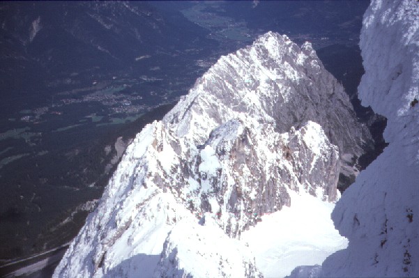 kann man den Weg bis zur Zugspitze sehen. Er ist verschneit und es gibt nicht einmal