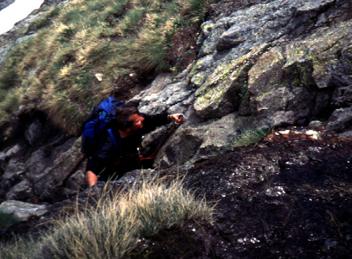 Der nächste Tag sollte wieder voll interessanter Erfahrungen werden. Nachdem die beiden Schüler endlich ihre Müdigkeit zugaben und einen Tag Pause forderten, gingen die Lehrer zur Borelli-Hütte los. Diese Hütte liegt auf kaum 2300 m, aber um sie zu erreichen, muß man etwa 500 m klettern. Das habe ich mir auch vorher überlegt, aber der innere Schweinehund wurde besiegt, und wir kletterten los. Die Wände die wir da erklimmen durften, erreichten fast immer die Senkrechte, ja manchmal überschritten sie diese sogar. Alles ging gut, bis der Weg um einen ziemlich bauchigen Felsen führte und als Fußstützen nur in den Fels eingeschossene Stifte vorweisen konnte. Das Problem waren nicht die Stifte selbst, sondern das, was unter ihnen lag, und da gab es erst wieder etwas 400 m tiefer. Diesmal war der Selbsterhaltungstrieb stärker, und ich kehrte um bis zu einem kleinen Plateau, wo ich auf die anderen meditierend gewartet habe. Nach drei Stunden sah ich frohen Gesichtern entgegen, und wir erreichten wohlauf den Zeltplatz. Zwar habe ich den Schülern nicht gesagt, daß ich nicht ganz oben war, aber falls sie diesen Pseudobericht lesen sollten, kann ich ihnen versichern, daß es vorkommt, daß auch erfahrenere Wanderer sagen: "es reicht - bis hierher und nicht weiter". Das wurde dann eigentlich auch unsere letzte Wanderung.